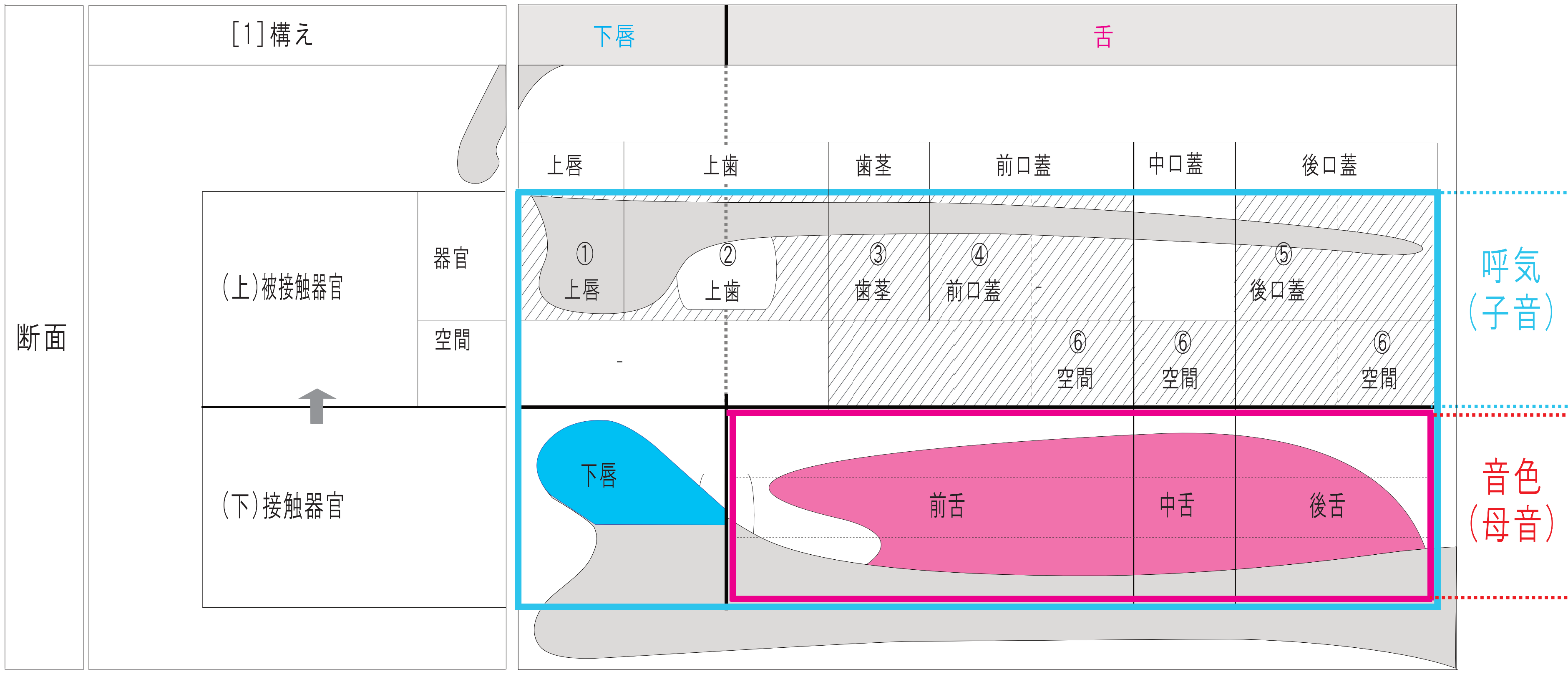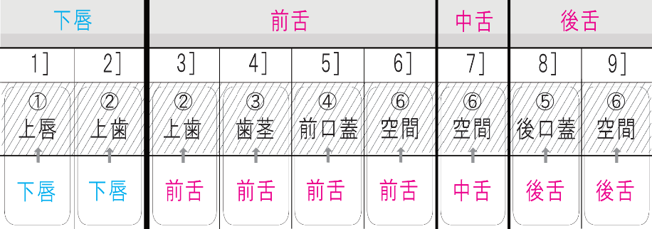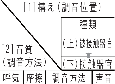 | [1] 構え (縦軸) | [2] 調音 (横軸) | [3] 音量 (横軸:子音) | ||