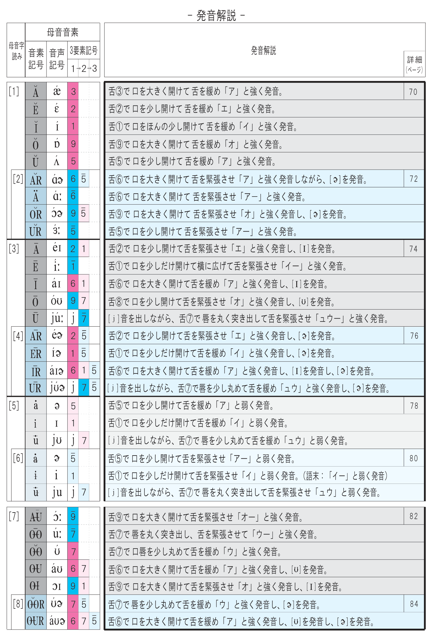 上図の音素記号は、上が「 IPA記号 」で、下が「 3要素記号 」と呼ばれる記号です。